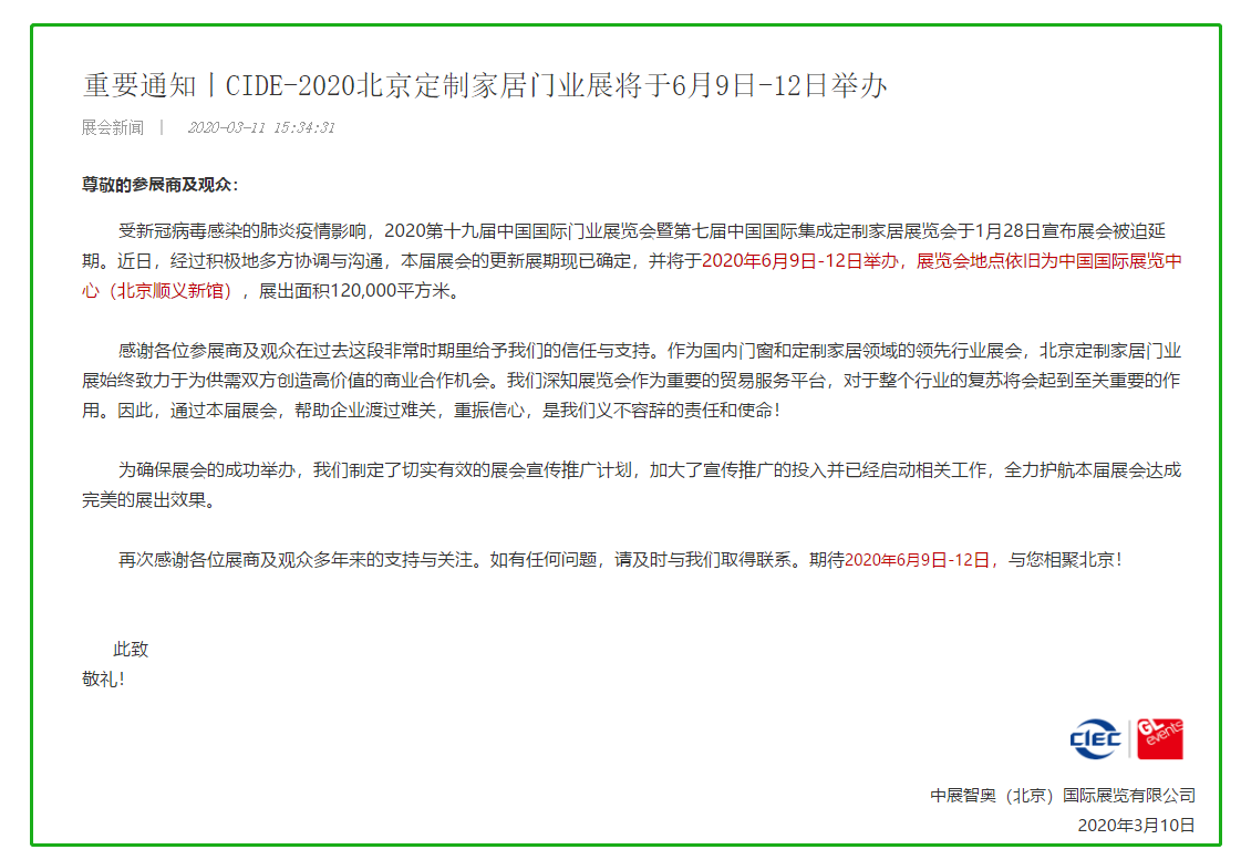 根據(jù)北京展會設計搭建公司領藝展覽了解到,受新冠病毒感染的肺炎疫情影響,2020第十九屆中國國際門業(yè)展覽會暨第七屆中國國際集成定制家居展覽會于1月28日宣布展會被迫延期。近日,經(jīng)過積極地多方協(xié)調與溝通,本屆展會的更新展期現(xiàn)已確定,并將于2020年6月9日-12日舉辦,展覽會地點依舊為中國國際展覽中心(北京順義新館),展出面積120,000平方米。如需北京展會設計請聯(lián)系領藝展覽,希望我們能在北京展會搭建上為您添磚加瓦,祝各位朋友收獲多多,滿載而歸!