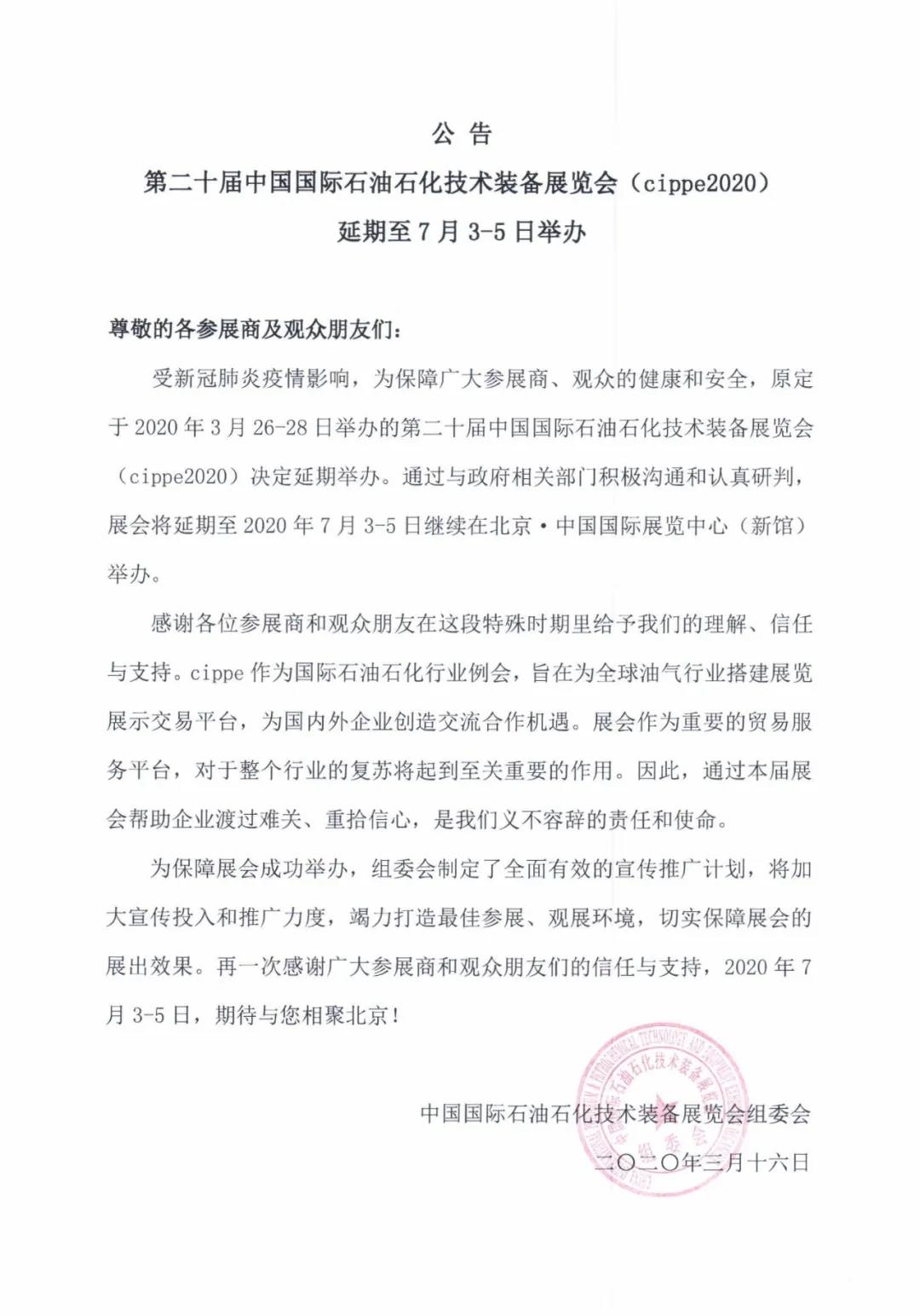 根據(jù)北京石油展設(shè)計搭建公司領(lǐng)藝展覽了解到原定于2020年3月26-28日舉辦的第二十屆中國國際石油石化技術(shù)裝備展覽會(cippe2020),將延期至7月3日至5日在北京·中國國際展覽中心(新館)舉行,歡迎您屆時參展參觀。如需北京石油展展會設(shè)計請聯(lián)系領(lǐng)藝展覽,希望我們能在北京石油展搭建上為您添磚加瓦,祝各位朋友收獲多多,滿載而歸!