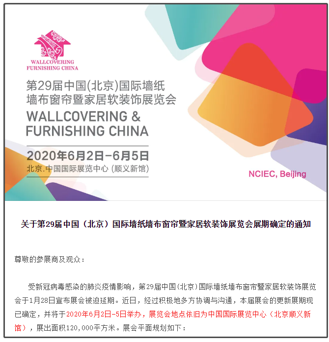 根據(jù)北京展會設(shè)計搭建公司領(lǐng)藝展覽了解到,受新冠病毒感染的肺炎疫情影響,第29屆中國(北京)國際墻紙墻布窗簾暨家居軟裝飾展覽會于1月28日宣布展會被迫延期。近日,經(jīng)過積極地多方協(xié)調(diào)與溝通,本屆展會的更新展期現(xiàn)已確定,并將于2020年6月2日-5日舉辦,展覽會地點依舊為中國國際展覽中心(北京順義新館),展出面積120,000平方米。如需北京展會設(shè)計請聯(lián)系領(lǐng)藝展覽,希望我們能在北京展會搭建上為您添磚加瓦,祝各位朋友收獲多多,滿載而歸!