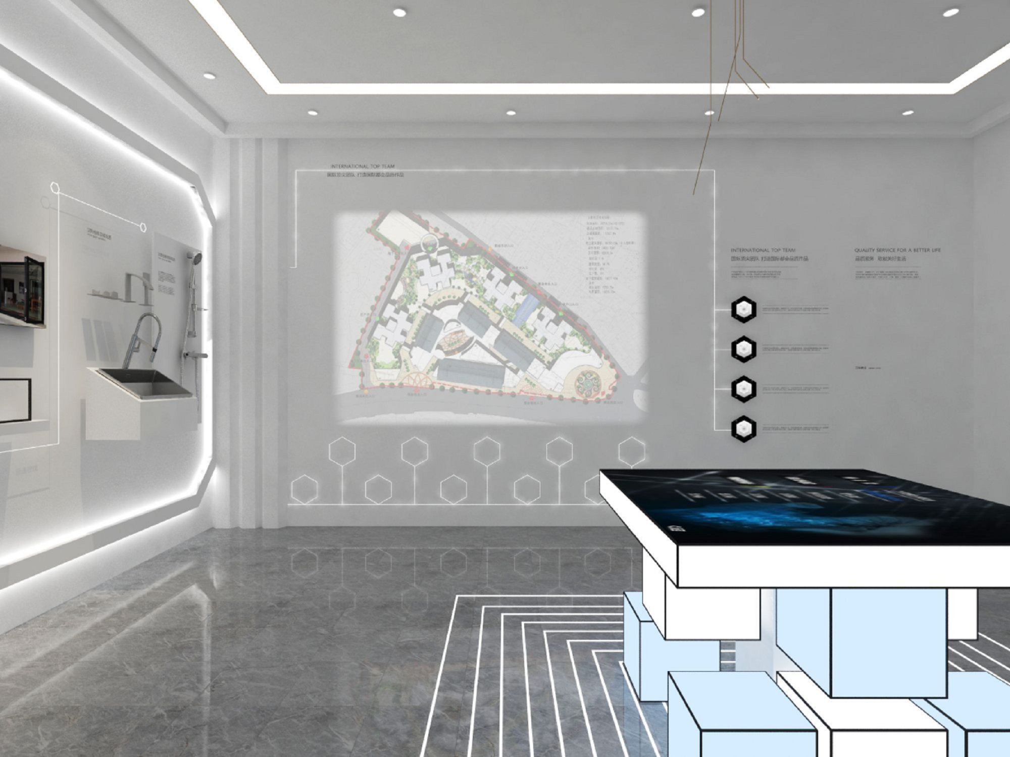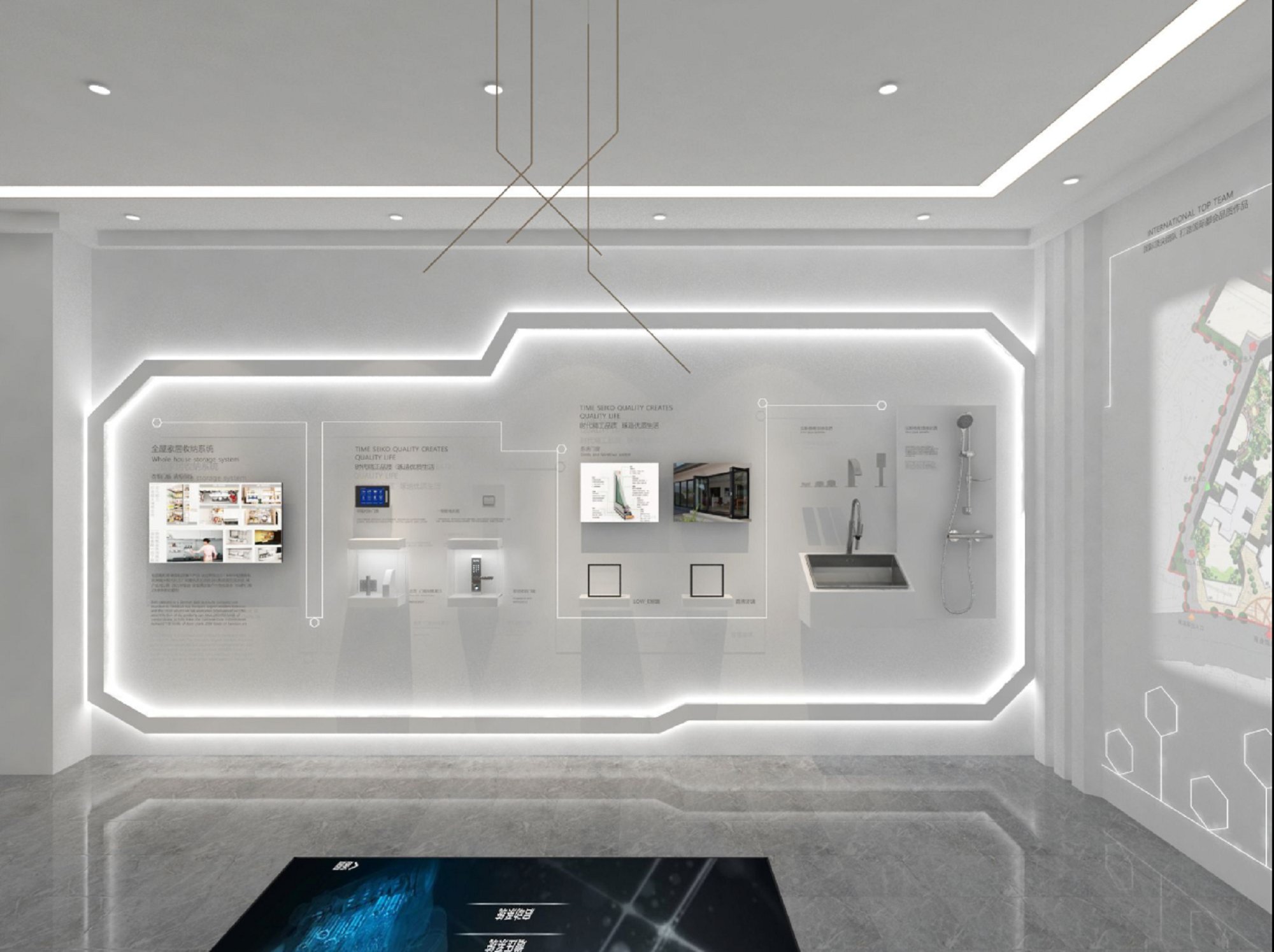 契合萬科的品牌形象和產(chǎn)品特性,采用開放式結(jié)構(gòu)進(jìn)行合理的分區(qū),再搭配燈具燈光的效果,襯托出展廳大氣、豪華的氛圍,突出一種簡約、時(shí)尚的品味。