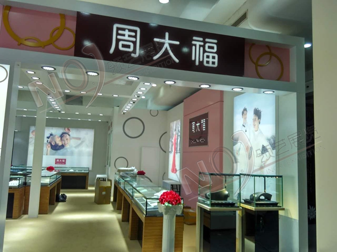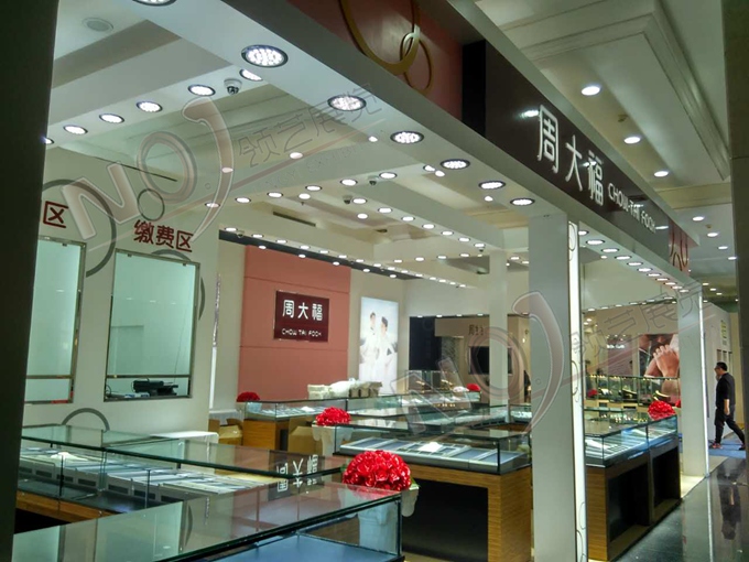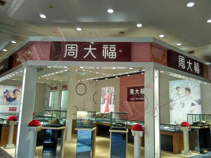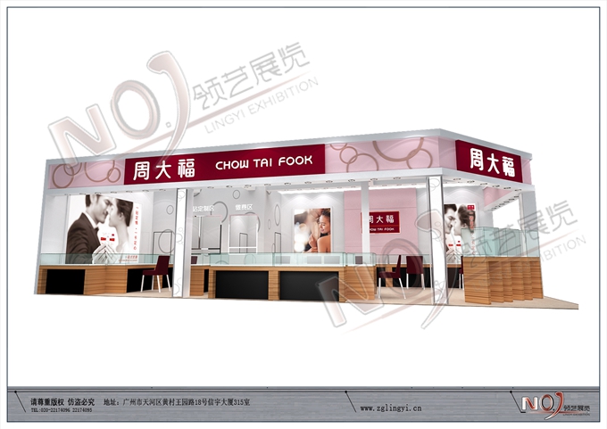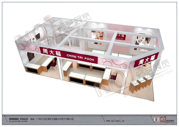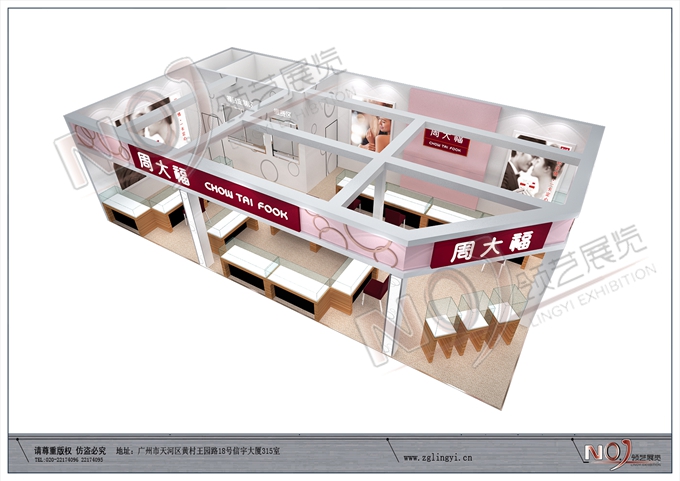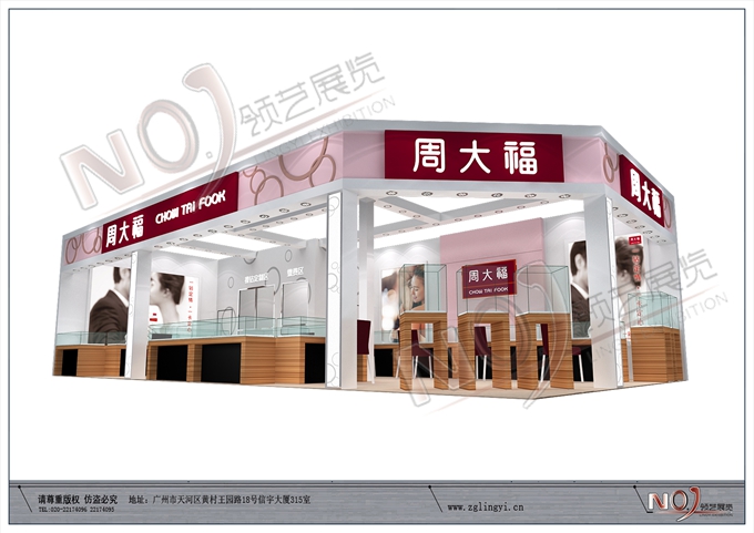 契合周大福的品牌形象和產(chǎn)品特性,采用矩形結(jié)構(gòu),再搭配燈具燈光的效果,襯托出展位高端、時尚的氛圍,突出一種現(xiàn)代、歐美的時尚品味。