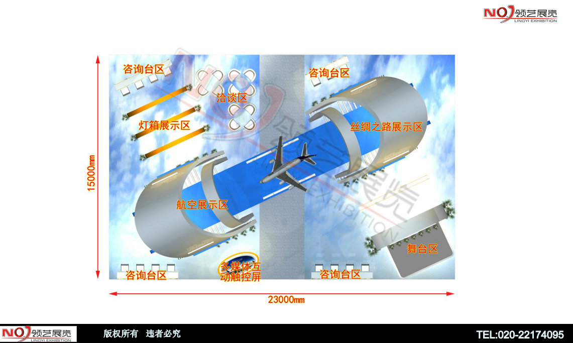 由航空飛機(jī)模型為創(chuàng)意主體,結(jié)構(gòu)采用弧形結(jié)構(gòu),展現(xiàn)海上絲綢之路國家的航空鏈接再搭配采用聲光電,襯托出展位大氣、豪華的氛圍,突出一種簡約、時尚現(xiàn)代感十足的國際化效果。