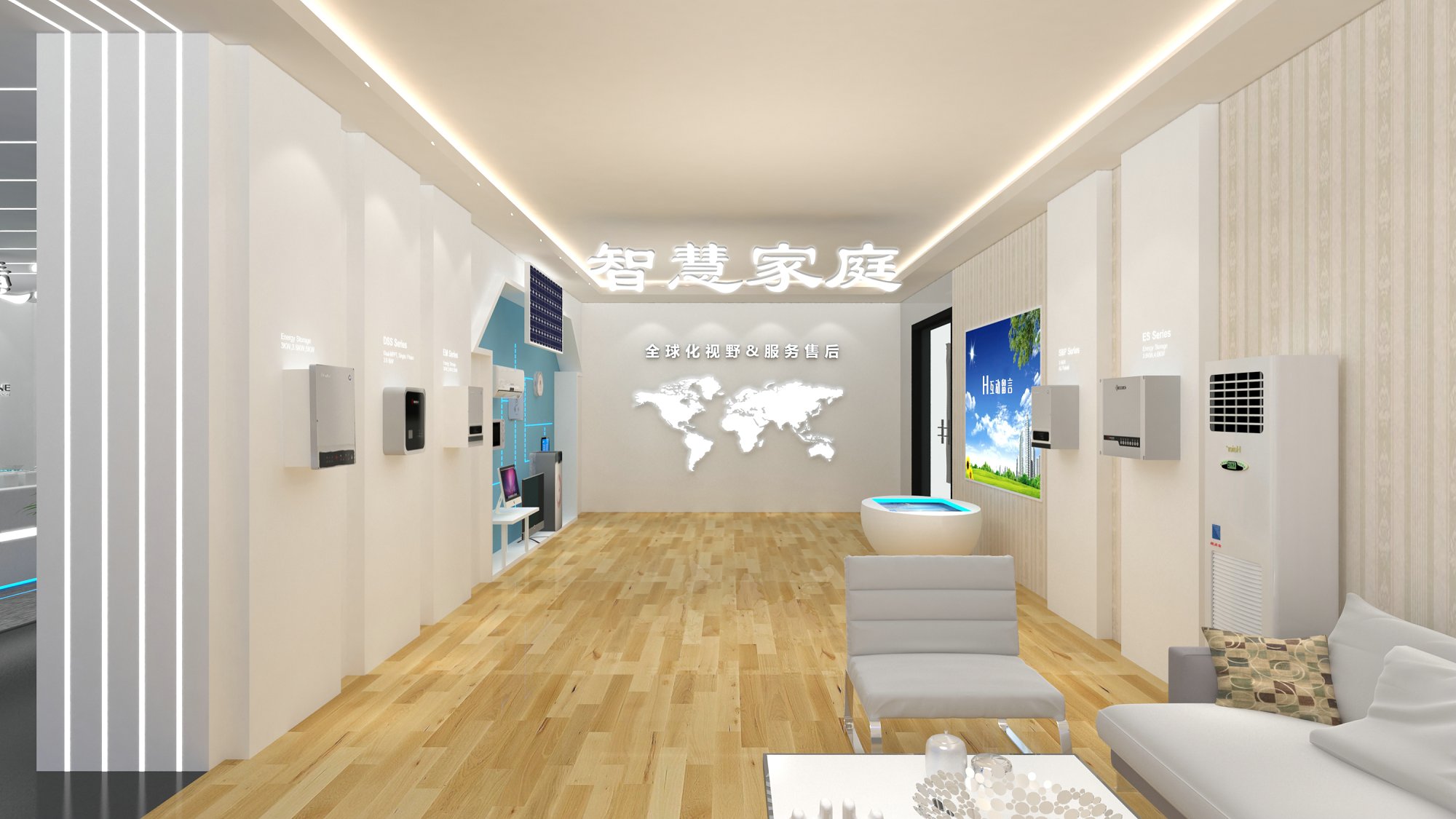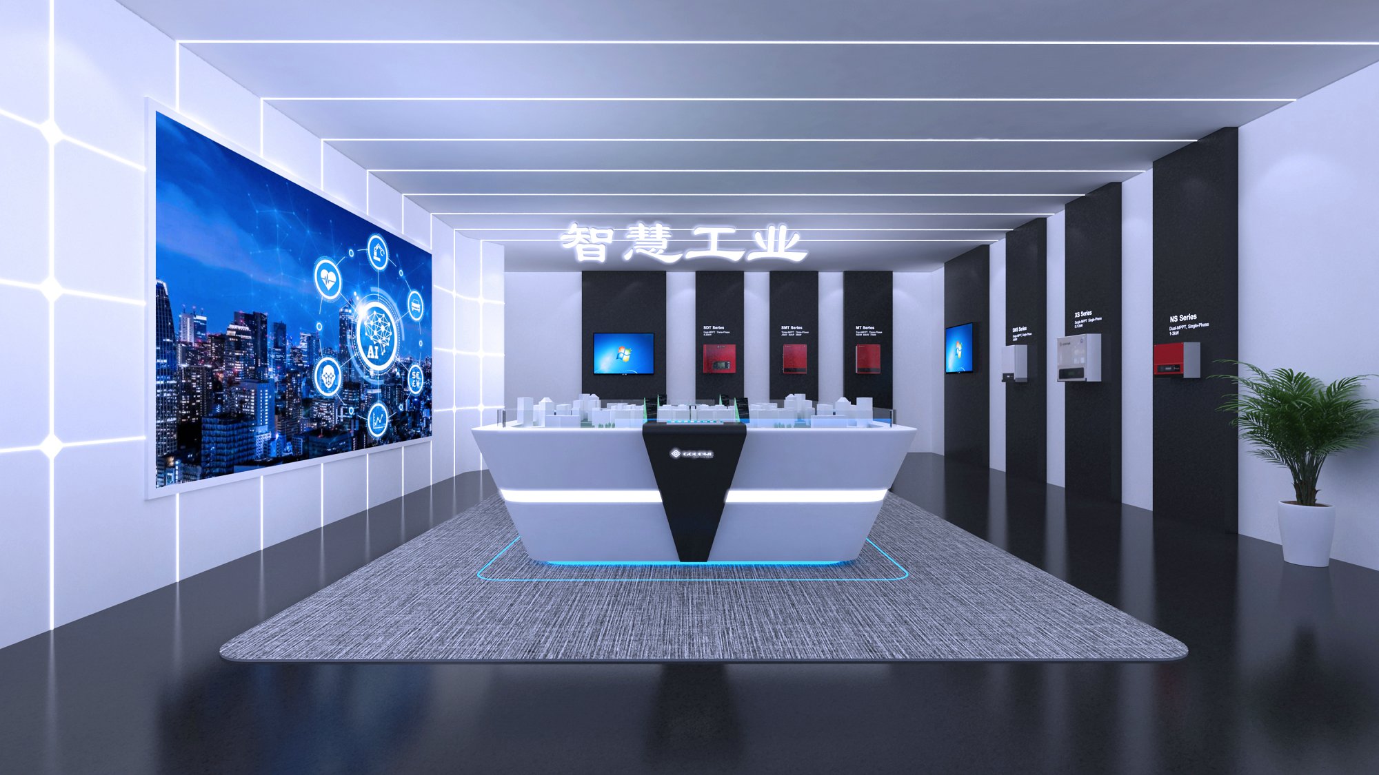 契合固德威的品牌形象和產(chǎn)品特性,采用開放式結(jié)構(gòu)進(jìn)行合理的分區(qū),再搭配燈具燈光的效果,襯托出展廳大氣、豪華的氛圍,突出一種簡(jiǎn)約、時(shí)尚的品味。